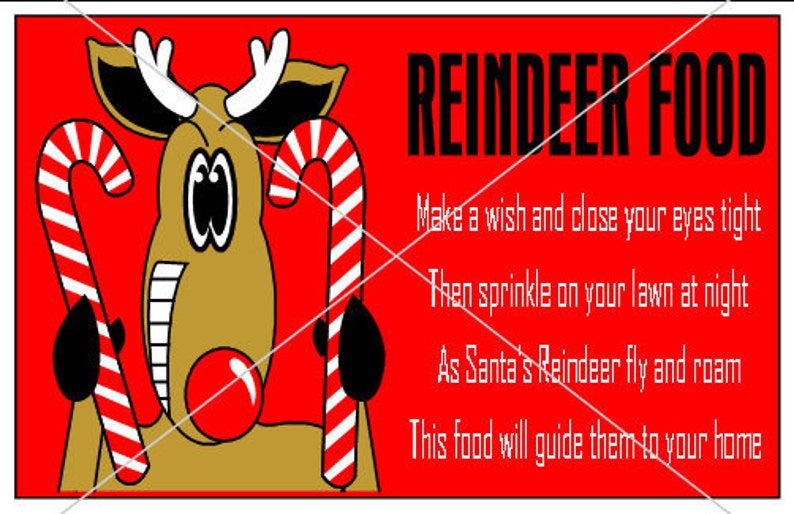 Reindeer Food Printable | Printable Reindeer Food Tags ... Just mix up some oats, Christmas sprinkles and a dash of glitter, bag it all up in ziploc-style snack bags, top with these printable tags, and give to the kids to toss on the lawn on Christmas Eve! Both red and green labels are included, so just use your favorite color or make extra for your family and friends. :) Each Reindeer Food label ... Sign in - Etsy Log in to your Etsy account.