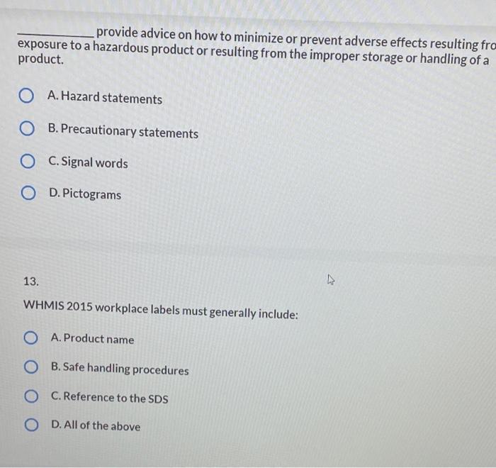 WorkSafeBC The employer must implement a mechanism by which bullying and harassment issues are reported to the employer including how, when, and to whom a worker should report incidents or complaints. Included must be procedures for a worker to report if the employer, supervisor, or person acting on behalf of the employer is the alleged bully and harasser. Statutes & Constitution :View Statutes : Online Sunshine The receptacle must also include a list of all the edible’s ingredients, storage instructions, an expiration date, a legible and prominent warning to keep away from children and pets, and a warning that the edible has not been produced or inspected pursuant to federal food safety laws. ... Implement an alcohol and drug-free workplace policy ... › oshanswers › chemicalsWHMIS 2015 - General : OSH Answers - Canadian Centre for ... Oct 06, 2022 · When a hazardous product is used in the workplace, employers are required to: Educate and train workers on the hazards and safe use of products. Ensure that hazardous products are properly labelled. Prepare workplace labels, as needed. Prepare SDSs, as necessary (e.g., if an employer manufactures a hazardous product that is used on-site).